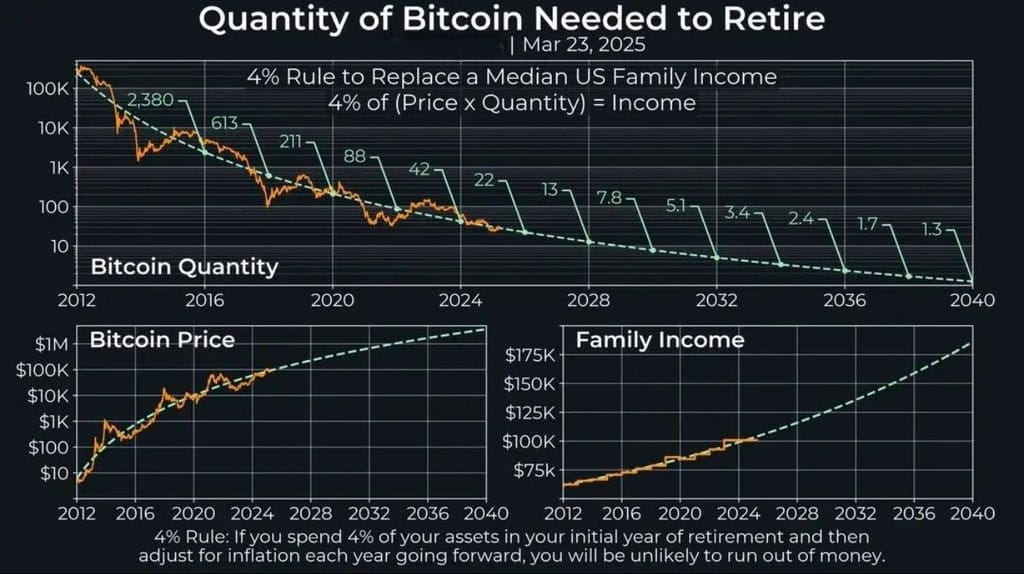Se ti sei chiesto quanto Bitcoin hai bisogno per andare in pensione comodamente, ecco un framework semplice ma potente che potrebbe cambiare il modo in cui guardi al tuo futuro finanziario. Con il Bitcoin che continua la sua traiettoria di crescita a lungo termine, la quantità di BTC necessaria per sostituire il reddito di una tipica famiglia statunitense sta diminuendo anno dopo anno.