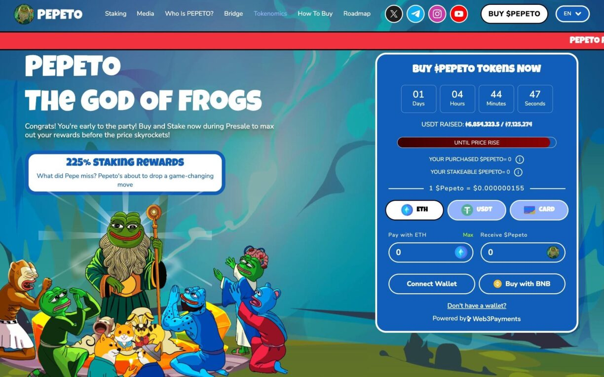Le vittorie più grandi iniziano quasi sempre prima che la folla si riversi su un progetto, di solito durante la presale di un progetto. Questo è ciò che rende Pepeto una scelta preferita per gli investitori veterani e gli analisti di gemme di presale online. Il token è attualmente valutato a $0.000000155, avendo già raccolto oltre $6.8 milioni. Il team, che è stato attivo su tutti i suoi canali social, afferma di essere focalizzato sulla costruzione di qualcosa di utile e duraturo che abbia un impatto reale nello spazio Web3 in futuro.