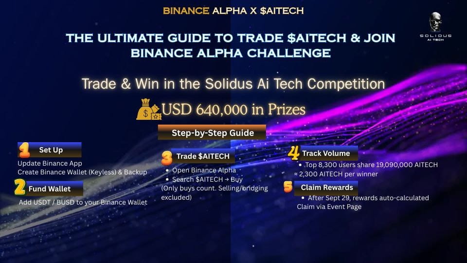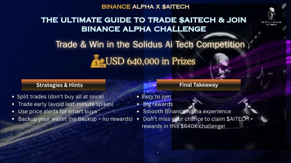 Binance Alpha sta facendo le cose in grande con $AITECH $640,000 in premi per i partecipanti E SÌ—puoi farlo da solo in pochi semplici passaggi! La competizione di trading Solidus Ai Tech è attiva su Binance Alpha, ed è uno dei modi più semplici per guadagnare ricompense mentre esplori il trading Web3.