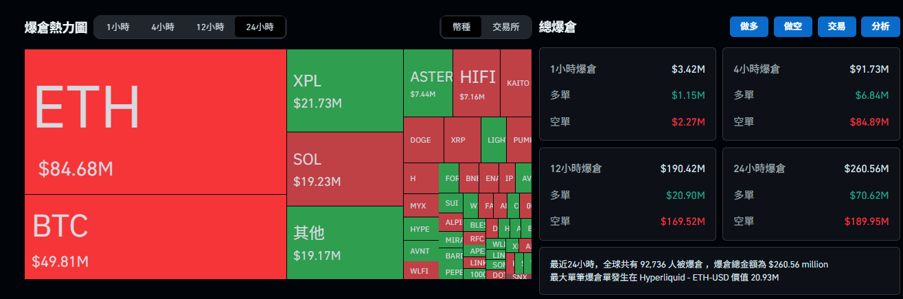Secondo i dati di Coinglass, durante questo rimbalzo, nelle ultime 24 ore un totale di 92.762 persone sono state liquidate, per un importo totale di circa 2.6 miliardi di dollari; di cui, le posizioni long sono state liquidate per circa 70 milioni di dollari, mentre le posizioni short hanno subito una liquidazione di 189 milioni di dollari.