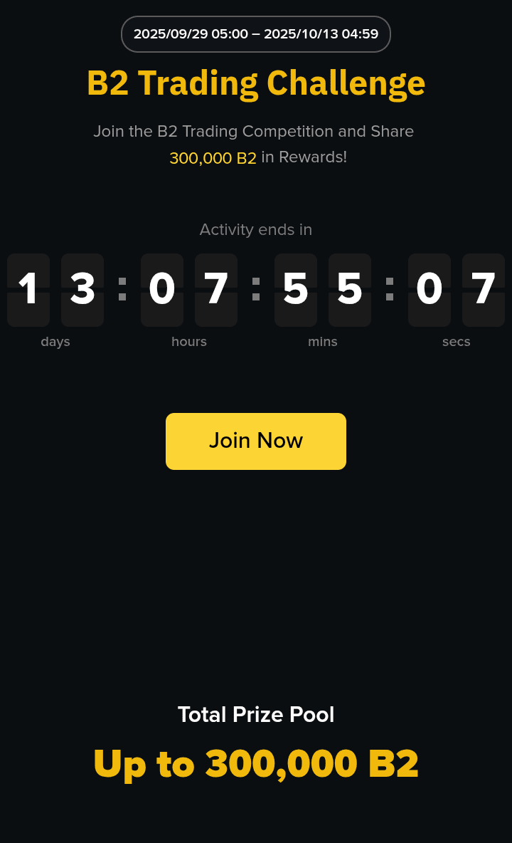 I primi 500 utenti idonei che confermano la loro partecipazione nella pagina dell'evento e scambiano un minimo di 10.000 USDT equivalenti su B2 USDⓈ-M Contracts su Binance Futures vinceranno ciascuno 40 token B2 su base 'primo arrivato, primo servito'.