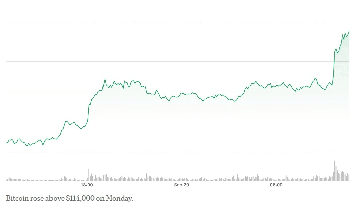 Il forte aumento del Bitcoin, iniziato nel weekend, è continuato fino alla sessione di trading di lunedì negli Stati Uniti (29 settembre), con il prezzo del Bitcoin che, dopo essere sceso sotto i 109.000 dollari venerdì scorso, è tornato a 114.000 dollari.