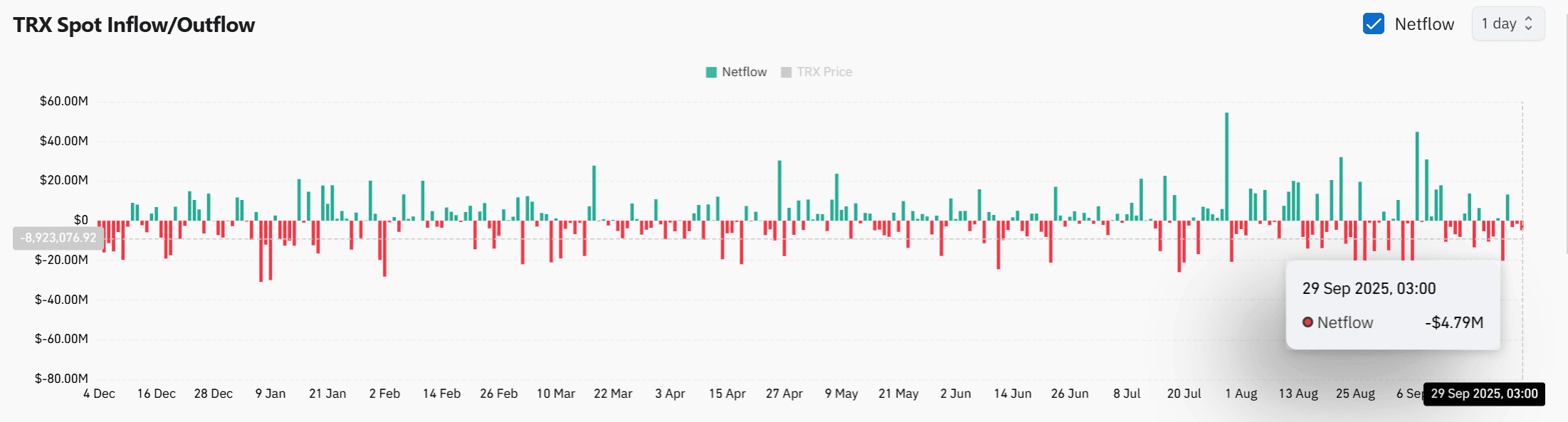 Il flusso netto di TRX spot ha continuato a mostrarsi a settembre, con un deflusso netto di 4,79 milioni di dollari il 29 settembre. Questo indica che la pressione di vendita sugli exchange si è alleviata, spingendo i detentori ad aumentare le loro posizioni.