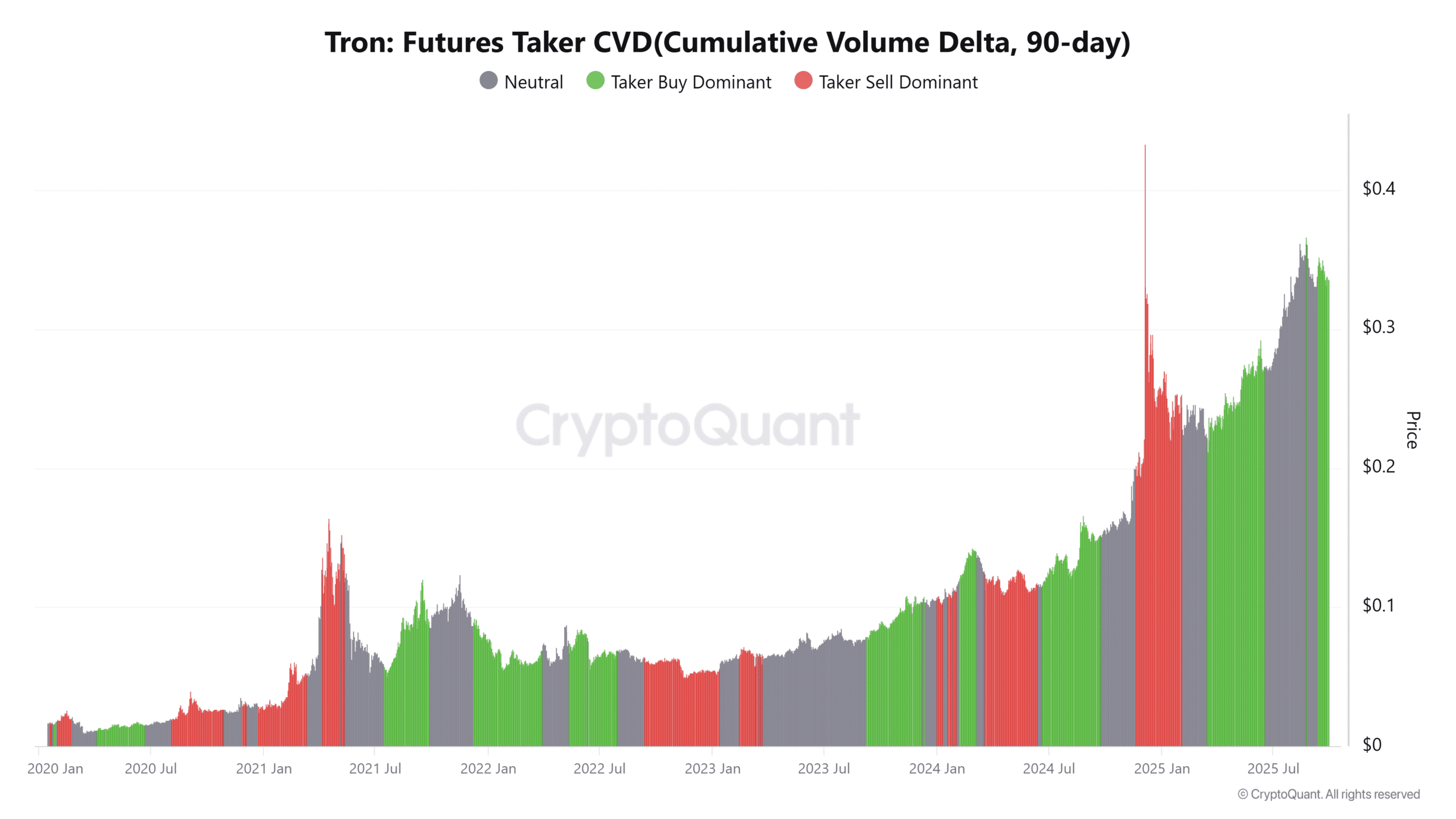 Il CVD (Volume di Trading Cumulativo) degli acquirenti di futures mostra che gli acquisti degli acquirenti dominano, suggerendo una propensione rialzista nel trading a leva. Quando gli acquisti degli acquirenti dominano, di solito indica che il prezzo spot salirà.