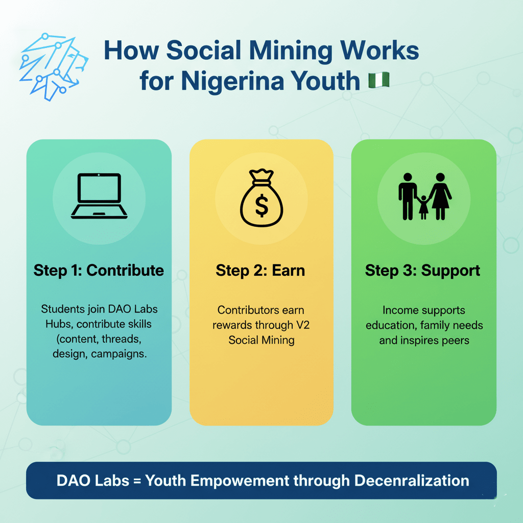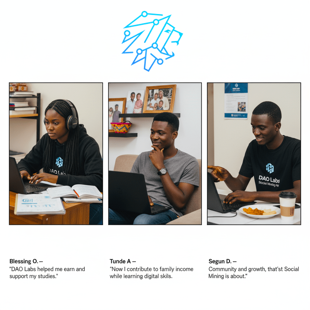 Ogni membro nigeriano della Comunità Daoversiana può vedere da vicino come DAO Labs potenzia i giovani che una volta erano trascurati dai mercati del lavoro tradizionali. Utilizzando il modello di Social Mining in V2, studenti e gruppi giovanili stanno trovando non solo uno scopo ma anche un flusso costante di reddito.