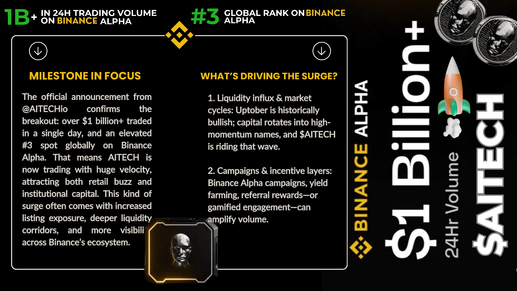 Come $BTC , $ETH , e le memecoin di tendenza dominano il chiacchiericcio—non dormire su $AITECH. In una svolta rialzista, ha appena superato $1B+ in volume di trading di 24 ore e ha raggiunto il ranking globale #3 (secondo le metriche di Binance Alpha). Questo non è solo hype—indica che qualcosa di strutturale si sta muovendo.