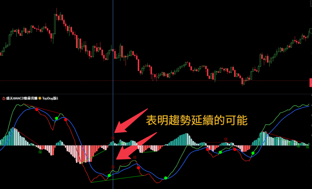 (🔵➤ Scenario di conferma della tendenza: utilizzare la direzione del DAD per confermare la tendenza a lungo termine e combinarla con l'istogramma MOM per determinare i punti di ingresso.