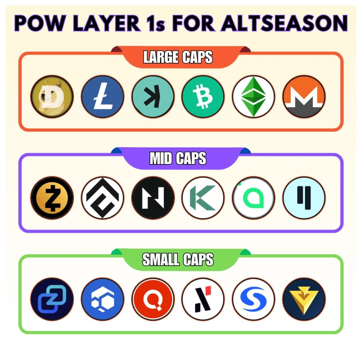 La stessa dinamica potrebbe svilupparsi con le piattaforme layer-1 PoW. Man mano che la narrazione si rafforza e l'attenzione mainstream si concentra su questo settore, il capitale fluirà lungo la scala della capitalizzazione di mercato cercando valore non scoperto. I progetti con forti fondamentali, sviluppo attivo e proposte di valore uniche potrebbero beneficiare enormemente.