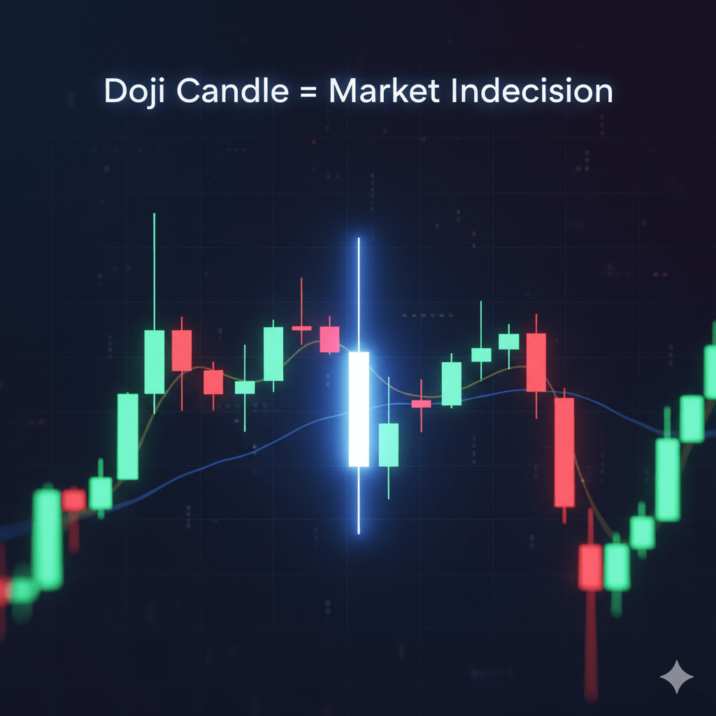 📖 Il Doji Candle è un tipo di candela che crea sempre confusione. Significa che acquirenti e venditori hanno entrambi la stessa forza – nessuno sta vincendo.