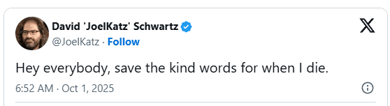Proprio quando la comunità si stava preparando a celebrare la sua carriera, Schwartz è tornato su X con un commento sarcastico che ha cambiato istantaneamente il tono. “Ciao a tutti, tenete le parole gentili per quando morirò”, ha pubblicato 💀.