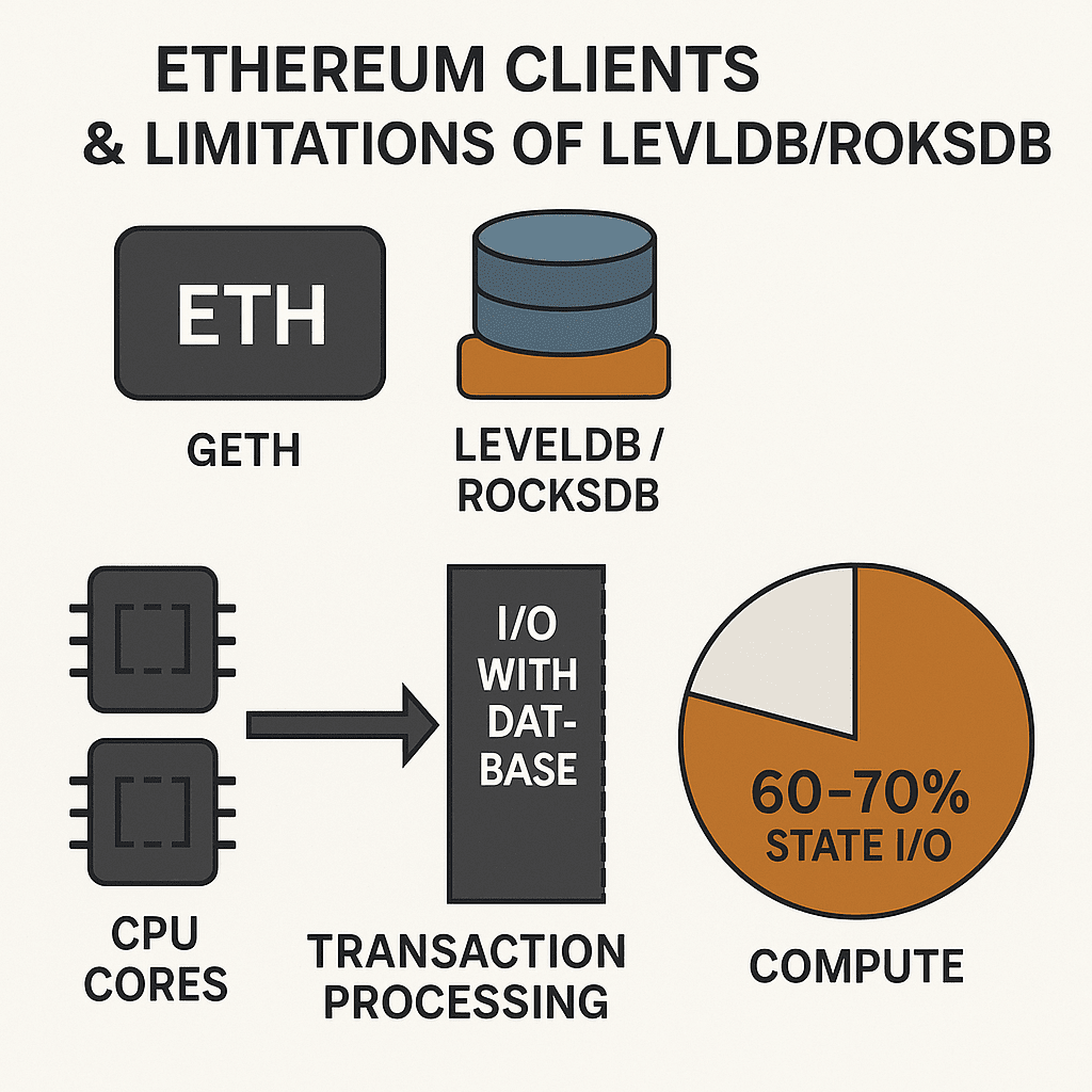 Client comuni come Geth o Reth utilizzano spesso LevelDB o RocksDB per gestire lo stato. Si tratta di database chiave-valore generali, non ottimizzati specificamente per le blockchain.