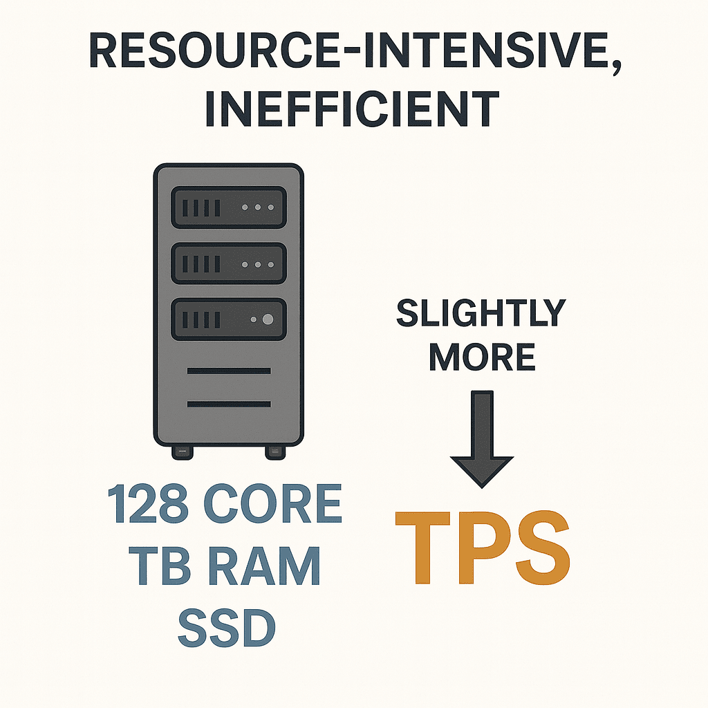 Alcune blockchain hanno provato a far funzionare i server estremamente potenti - CPU da 128 core, RAM da diversi terabyte, dischi SSD costosi. Ma le prestazioni effettive non sono migliorate molto.