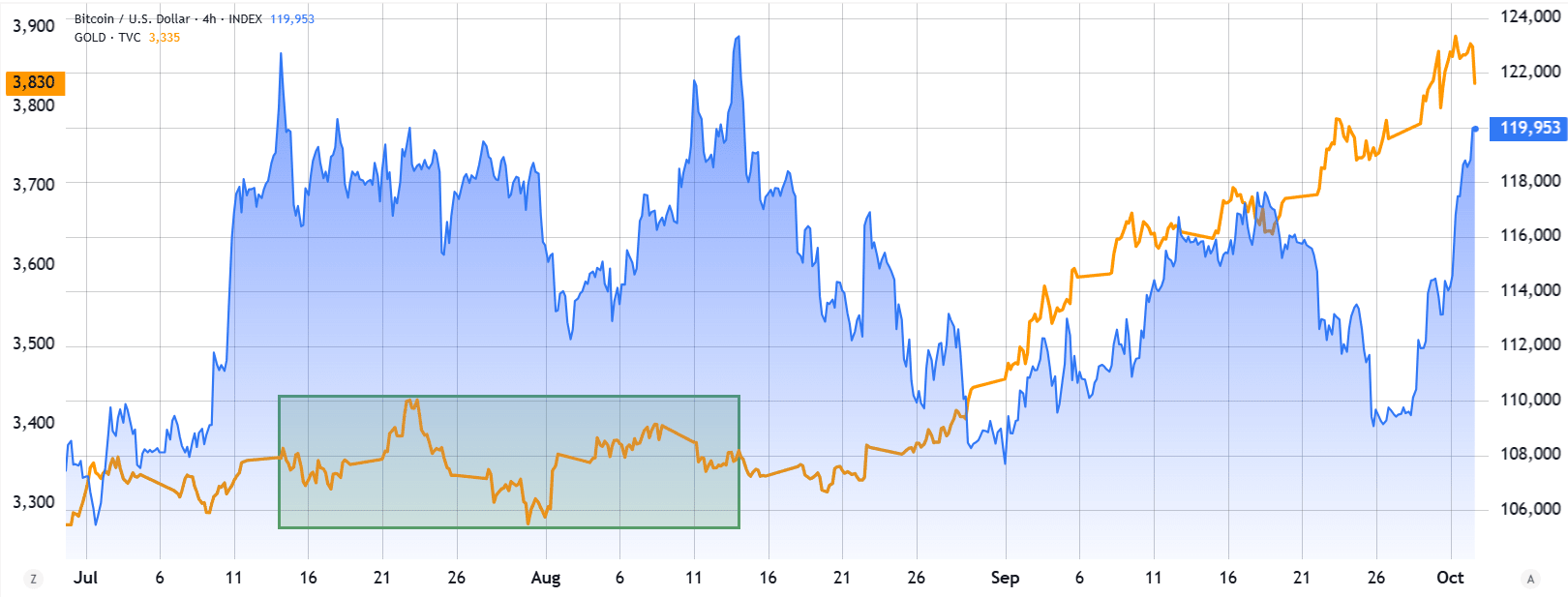 I trader che hanno acquistato bitcoin a un prezzo superiore a $120 000 ad agosto sono rimasti delusi, poiché le tariffe doganali non hanno avuto un impatto negativo sul saldo commerciale degli Stati Uniti o sulle vendite al dettaglio, almeno nel breve periodo. L'aumento del bitcoin in ottobre ha coinciso con una crescita del 16% dei prezzi dell'oro nelle ultime sei settimane, mentre i dati del World Gold Council indicano un accumulo costante di oro da parte delle banche centrali.
