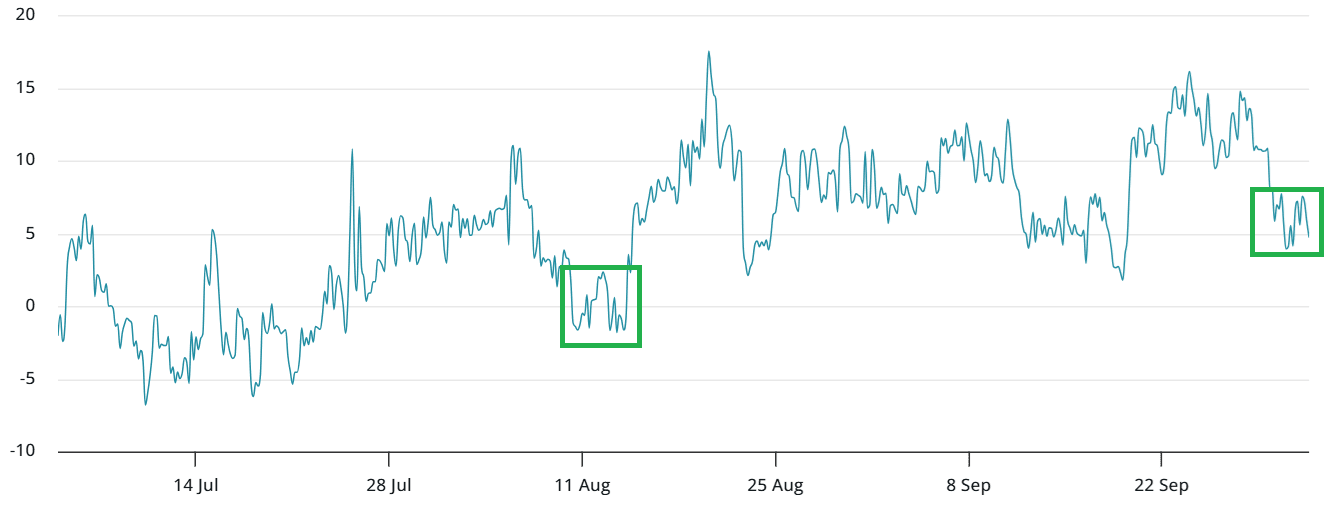 Secondo i dati sui derivati, nei tre giorni precedenti al massimo storico del bitcoin a metà agosto, i trader stimavano probabilità pressoché uguali di aumento e diminuzione del prezzo. Tuttavia, oggi lo stesso indicatore delle opzioni su BTC segnala preoccupazioni moderate per una correzione: le opzioni put (vendita) vengono scambiate con un premio rispetto alle opzioni call (acquisto).