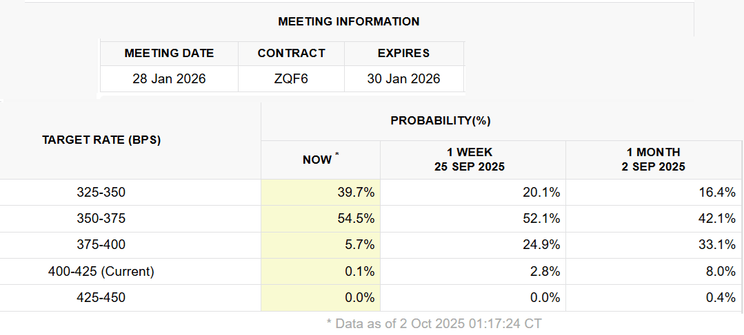 Secondo lo strumento FedWatch della CME, la probabilità prevista che la Federal Reserve degli Stati Uniti riduca i tassi al 3,50% o inferiore entro gennaio 2024 è attualmente del 40%, rispetto al 18% a metà agosto. Gli investitori possono accogliere con favore l'attuale dinamica dell'inflazione, ma la continua debolezza del mercato del lavoro potrebbe mettere a rischio il recente massimo storico dell'indice S&P 500, soprattutto in un contesto di incertezze legate alla sospensione del governo degli Stati Uniti.
