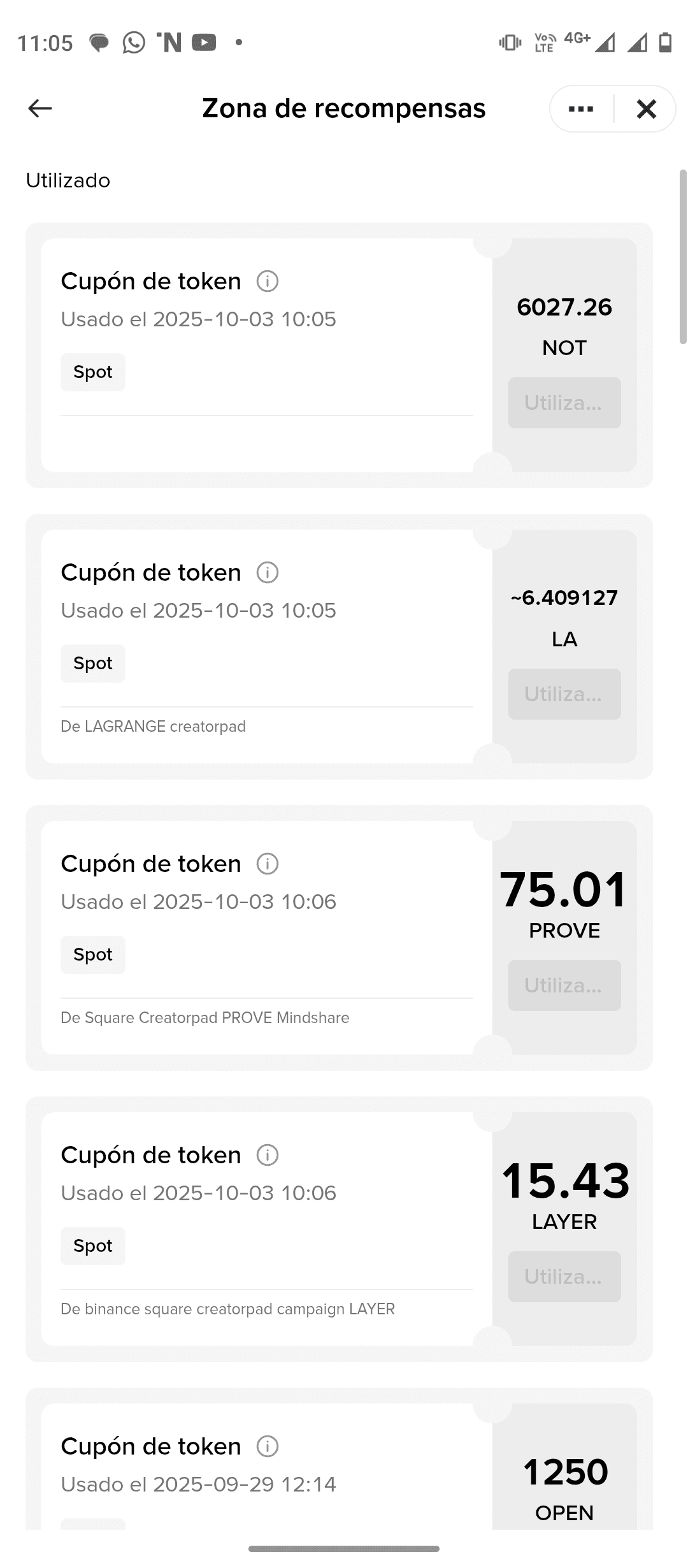 Nella mia Zona di Ricompense appaiono i coupon che ho ricevuto di recente grazie al mio lavoro costante pubblicando e educando sul trading e le criptovalute. Queste sono solo alcune delle ultime ricompense che mi ha dato Binance Square: