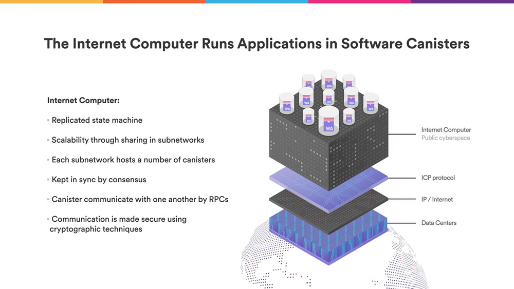 Il codice e i dati di ciascun contenitore vengono archiviati su ogni nodo all'interno della sua sottorete, garantendo la tolleranza agli errori in caso di problemi del nodo. Questa replica è facilitata dall'ICP, che presenta un meccanismo di consenso ad alto rendimento e un'efficiente macchina virtuale WebAssembly, il tutto supportato da una blockchain.