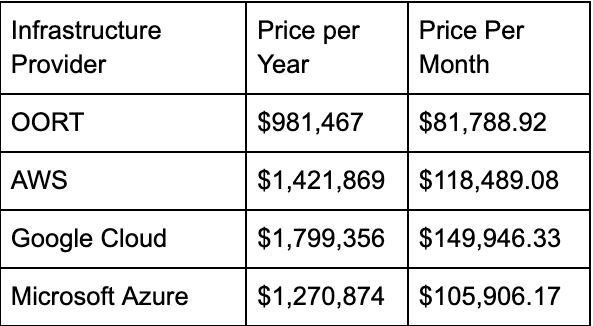 Ad esempio, OORT risparmia fino all’80% utilizzando un’infrastruttura decentralizzata ottimizzata a livello globale. Per illustrare l’efficienza in termini di costi di OORT, esaminiamo alcune cifre. Immagina di archiviare 1024 TB di dati all'anno e di scaricarli integralmente ogni mese.