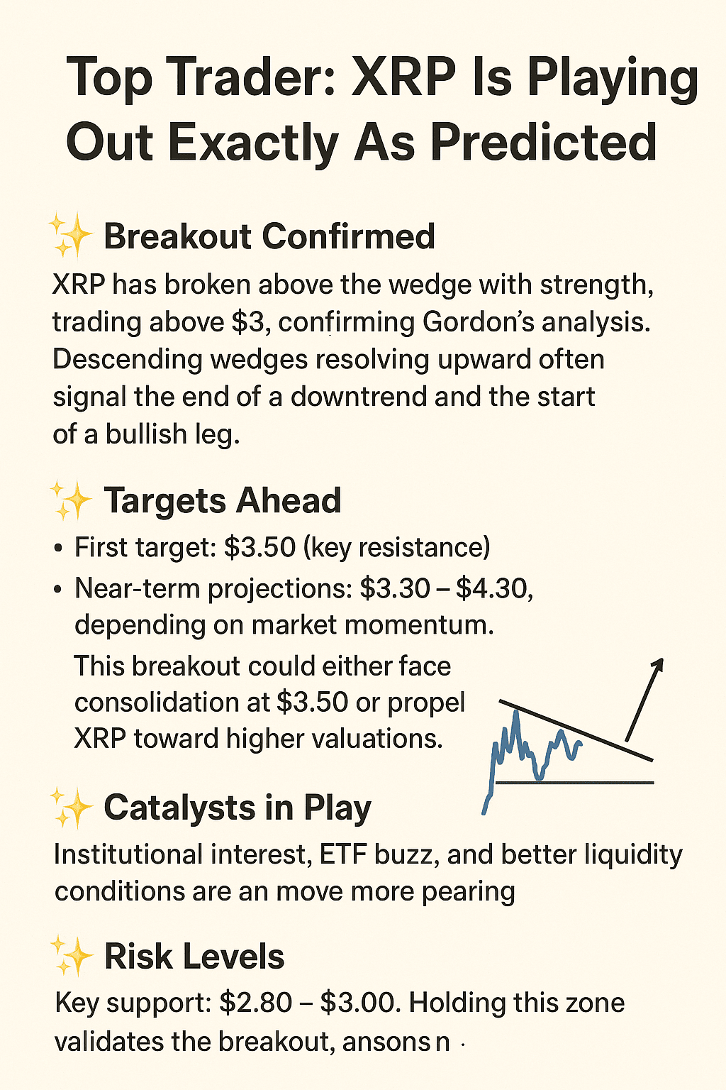 XRP ha rotto sopra il cuneo con forza, negoziando sopra i $3, confermando l'analisi di Gordon. I cunei discendenti che si risolvono verso l'alto spesso segnalano la fine di un trend ribassista e l'inizio di una gamba rialzista.