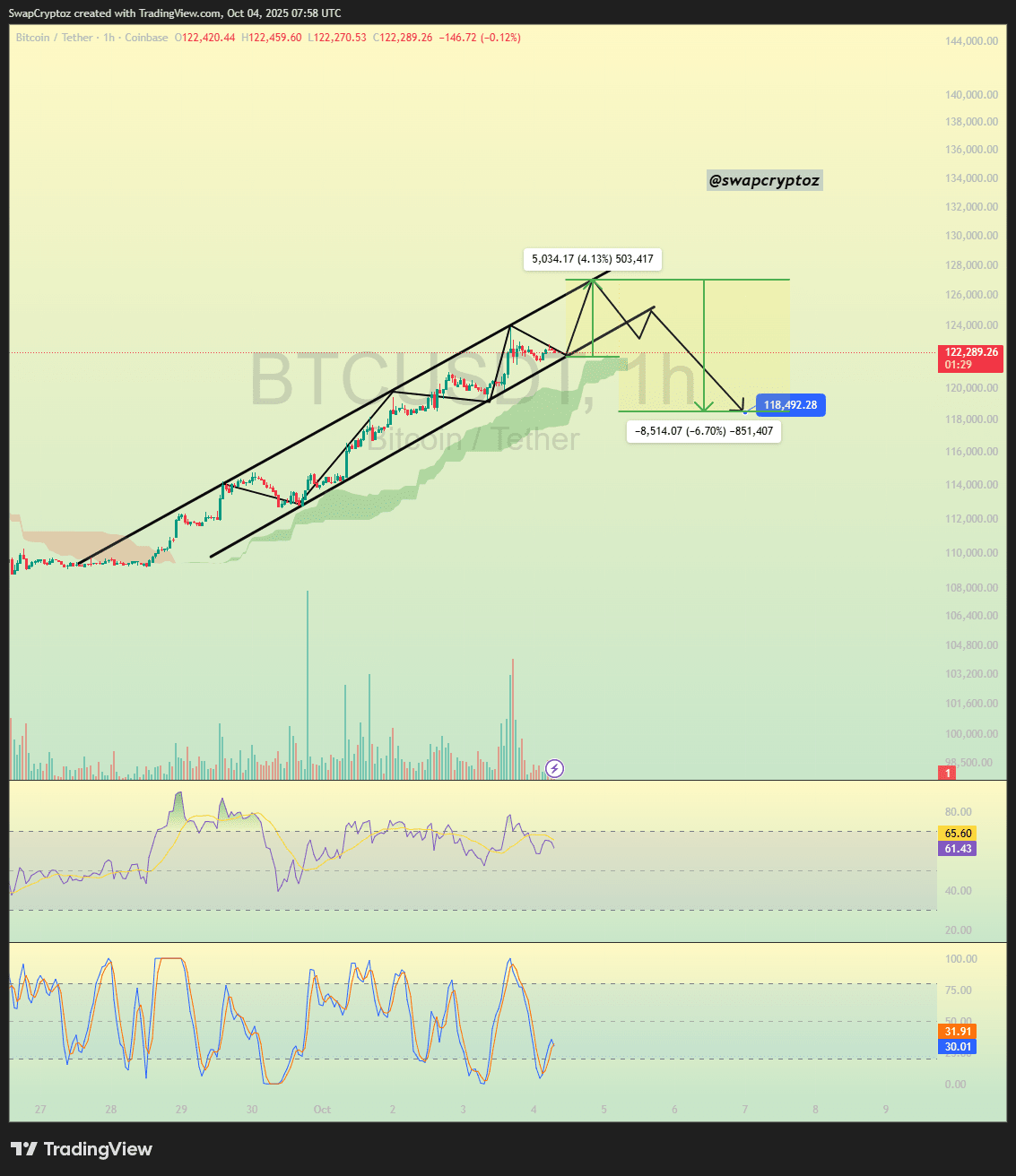 Bitcoin è stato in movimento in un canale, ma questo grafico prevede che raggiungerà un picco presto. Aspettati un piccolo, ultimo slancio verso l'alto, seguito da un forte calo del prezzo nella zona di $118,500.