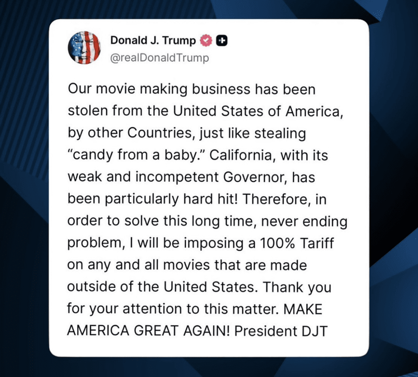 Il presidente Trump ha annunciato che imporrà un dazio del 100% su tutti i film prodotti al di fuori degli Stati Uniti, affermando che l'industria cinematografica americana è stata "rubata" da altri paesi.