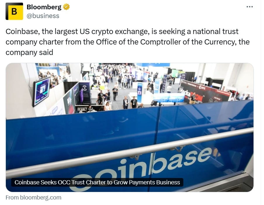 Coinbase richiede un federal trust charter, senza l'intento di diventare una banca