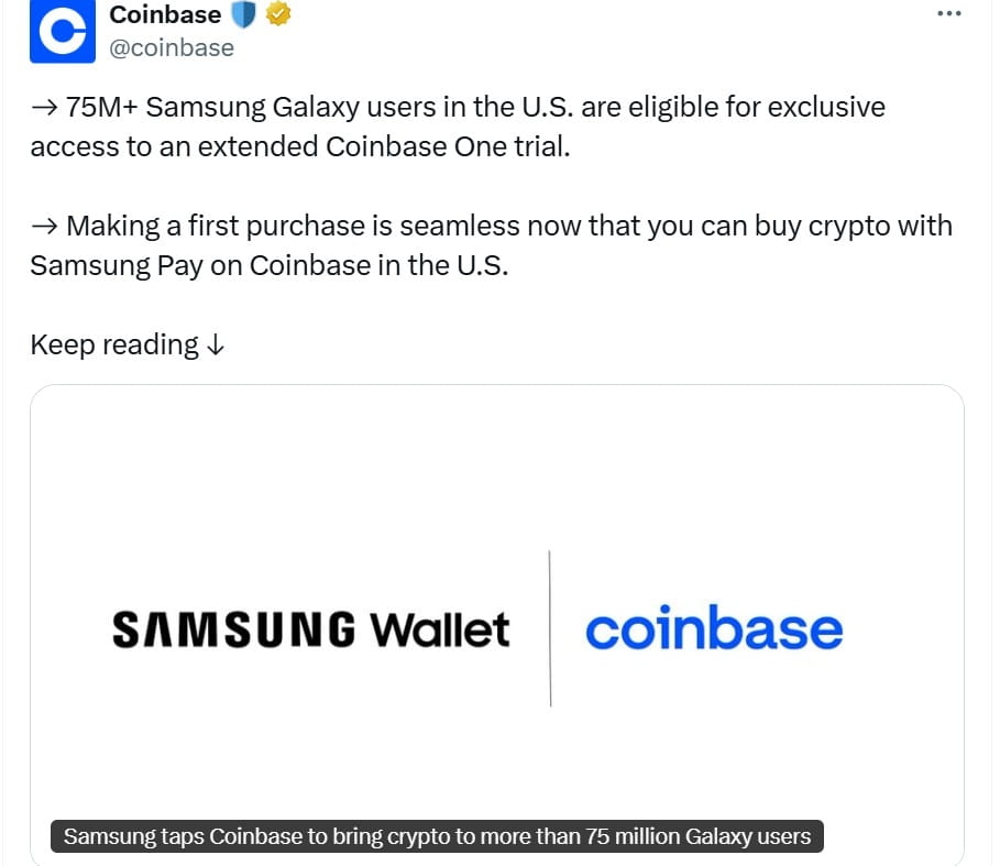 In un movimento parallelo dei consumatori, Samsung e Coinbase hanno ampliato la loro partnership in modo che milioni di proprietari di Galaxy negli Stati Uniti e in Canada possano ora acquistare crypto direttamente tramite Samsung Wallet e Samsung Pay. Il team afferma che questa integrazione apre l'accesso a Coinbase a circa 75 milioni di utenti di dispositivi Galaxy, e alcuni proprietari di Galaxy ottengono accesso e vantaggi speciali di Coinbase One. Questa partnership probabilmente aumenterà l'onboarding al dettaglio rendendo più facili gli acquisti all'interno di un portafoglio telefonico familiare.