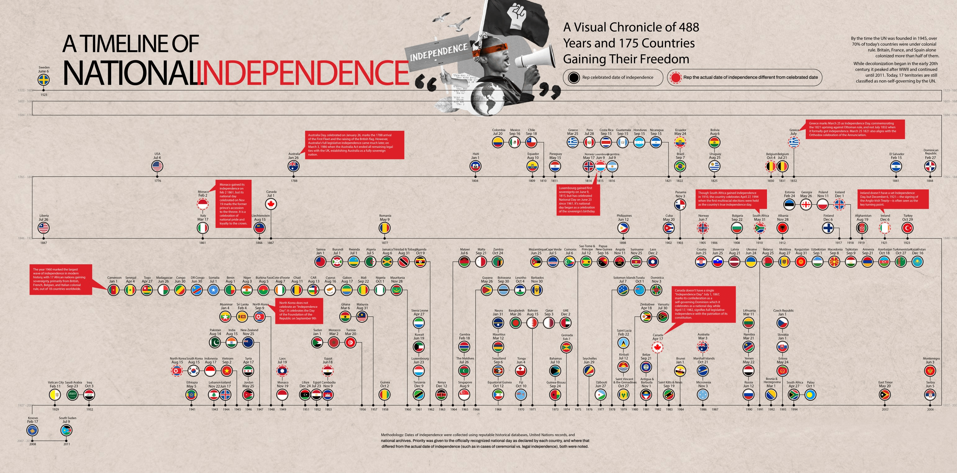 Il viaggio della libertà globale è lungo e variegato. Dalla Svezia nel 1523 al Sud Sudan nel 2011, questa infographic e dataset mappano i giorni di indipendenza ufficiali e simbolici di 175 nazioni, mostrando come la sovranità si sia sviluppata nel corso di cinque secoli.