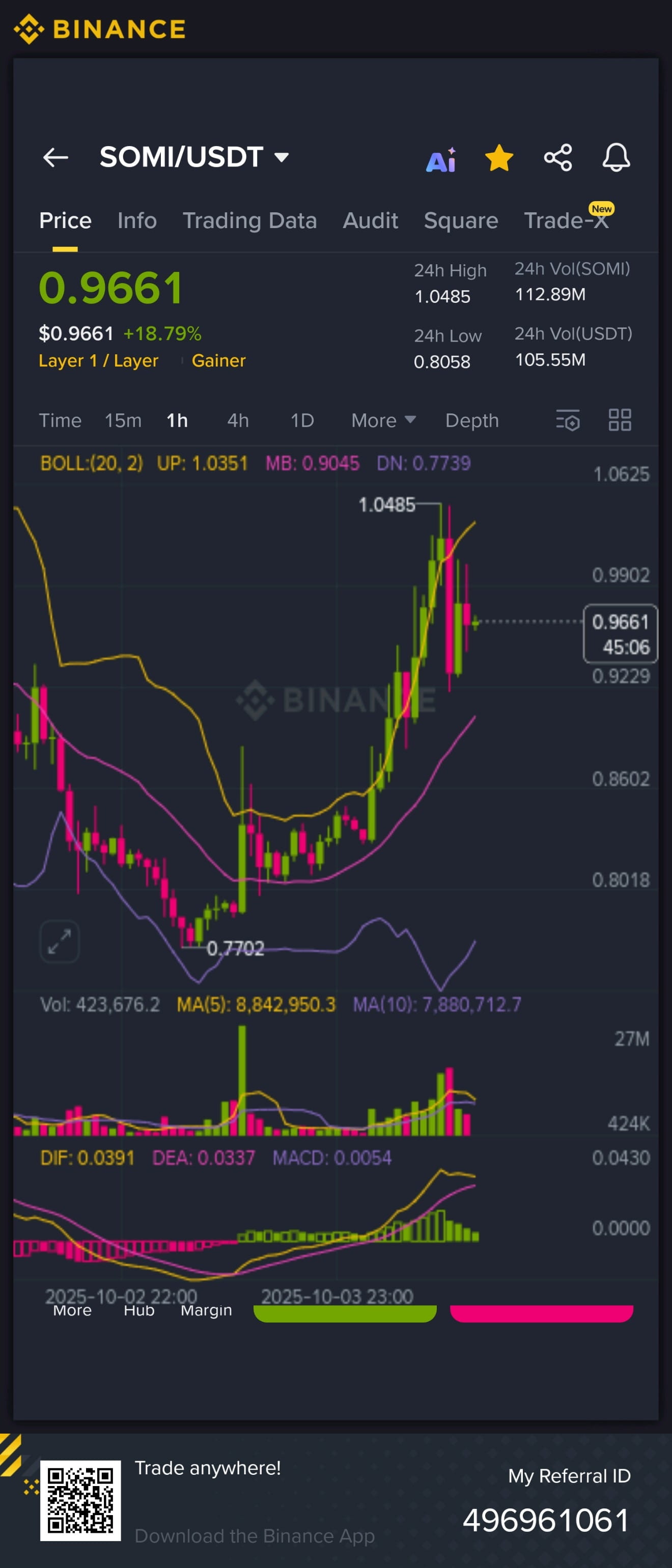 Nel grafico di 1 ora di oggi, vediamo SOMI negoziare attorno a $0.96, in aumento di circa +18 % nelle ultime 24 ore. Questo dopo aver testato un massimo di $1.0485 e rimbalzato da $0.8058. Le Bande di Bollinger mostrano compressione tra MB = 0.9043 e UP = 1.0346, il che significa che la volatilità si sta restringendo prima di un possibile breakout.