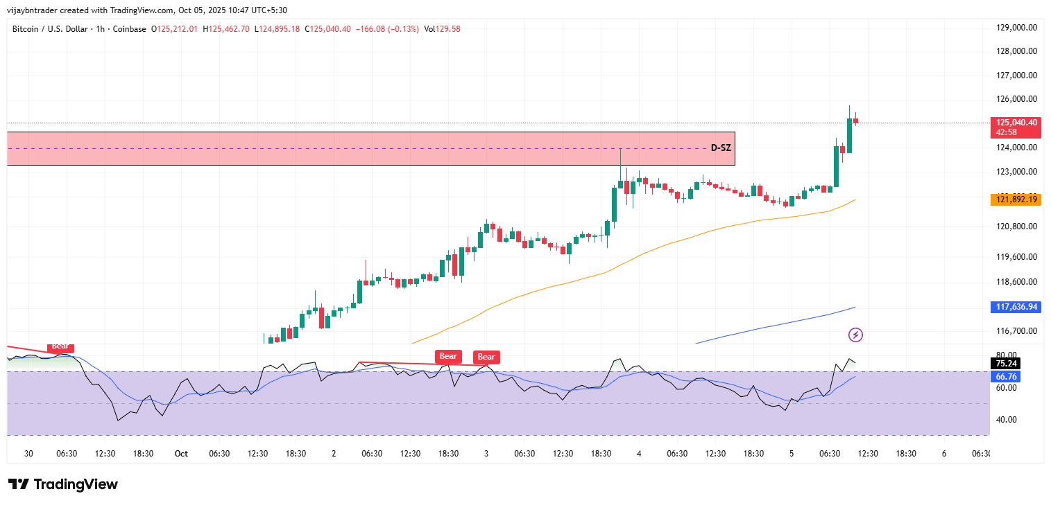 BTC si è esteso a 125.1k dopo aver superato 123.0k–123.8k e ora sta premendo l'offerta superiore giornaliera/4h; il momentum rimane rialzista su tutti i frame, ma il prossimo passo necessita di accettazione sopra 125.5k–126.0k alla chiusura, altrimenti ci si aspetta un ritracciamento controllato verso 123.8k → 122.6k → 121.9k dove le MA in aumento e il regime RSI-50 dovrebbero essere difesi nel trend.