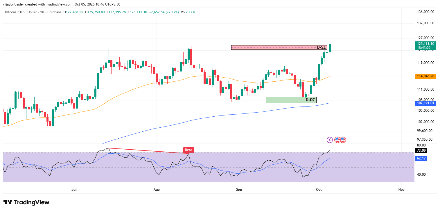 Contesto: Il prezzo è passato da una domanda di 111k–112k a 125k con una candela di breakout a ampia gamma; l'offerta giornaliera immediata si trova grossomodo tra 125.5k–126.0k, e solo una chiusura giornaliera attraverso questo intervallo apre a 127.2k–128.0k successivamente.