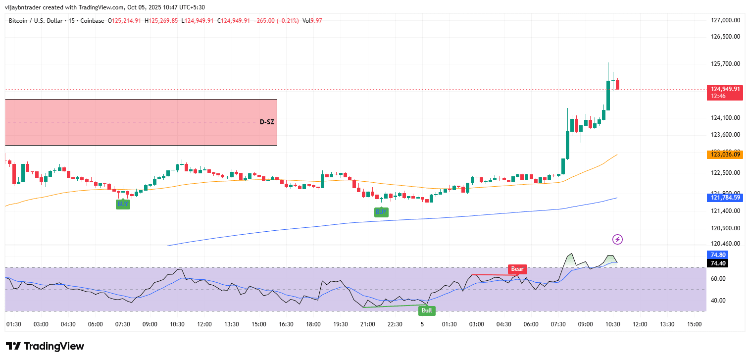 Fade tattico: Mentre il prezzo rimane bloccato sotto 125.5k–126.0k e l'RSI non riesce a mantenere >50 su 15m/1h, fade i picchi in 125.2k–125.5k con rischio sopra 126.1k; coprire 124.6k → 123.8k, estendere a 122.6k se il momentum scivola.