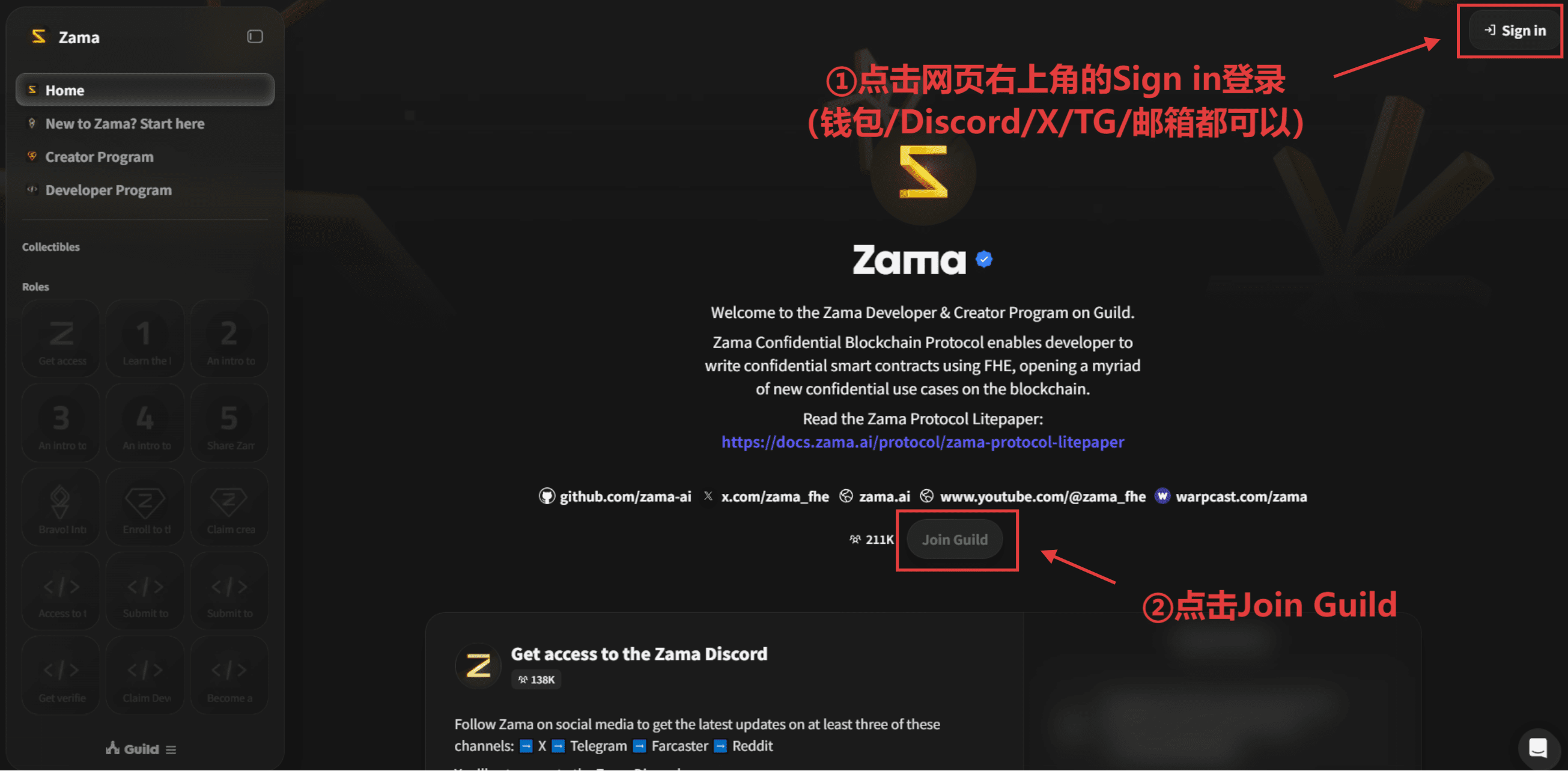 Clicca su Sign in in alto a destra della pagina (puoi accedere con portafoglio, Discord, X, TG, e email), poi clicca su Join Guild