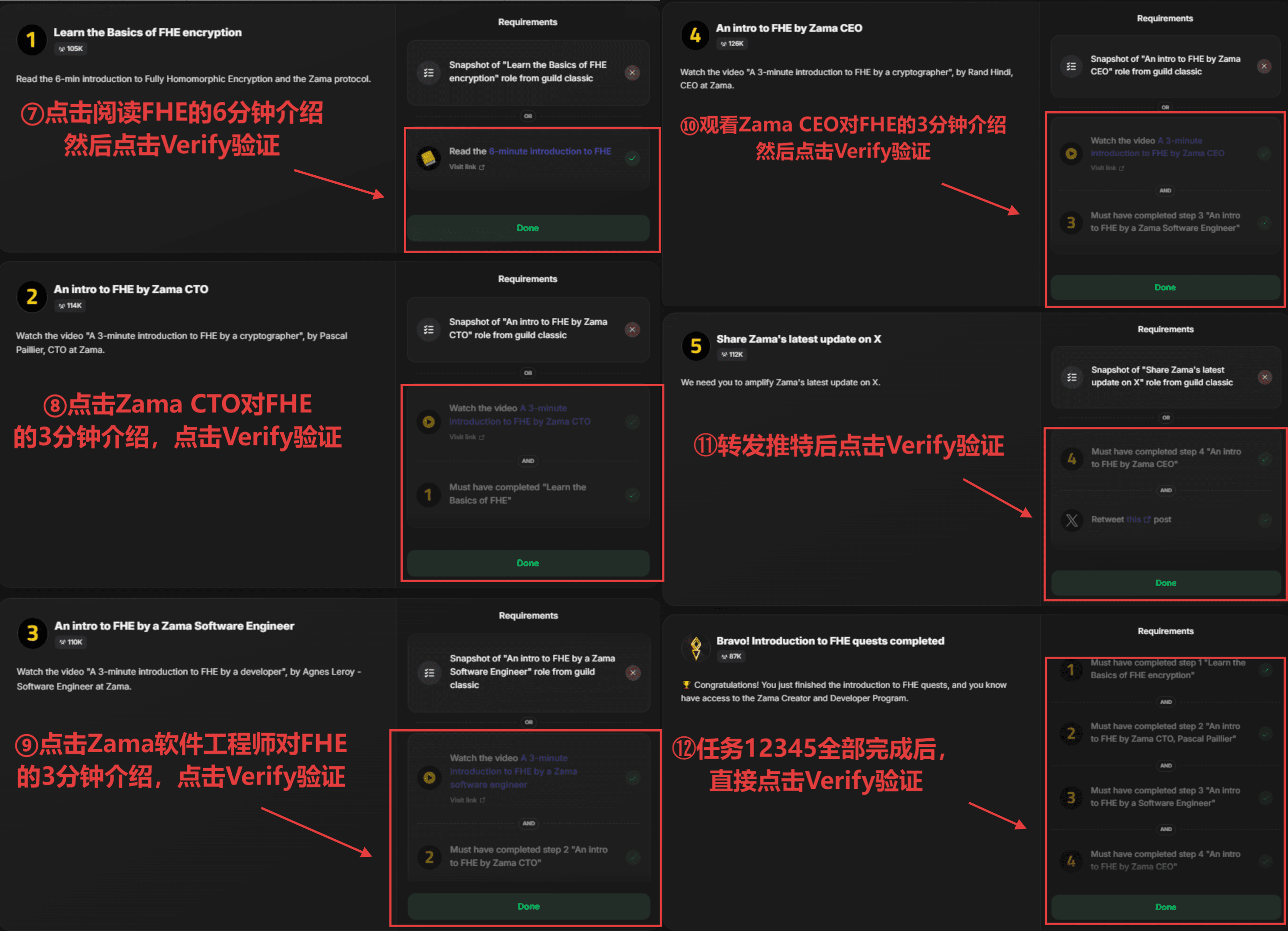 Collegati prima al tuo account X e/o Farcaster su Guild, segui @zama_fhe e poi crea e condividi contenuti relativi a Zama o FHE (ricorda che devi includere @zama_fhe o #ZamaCreatorProgram per essere tracciato e ricevere ricompense)