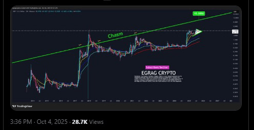 Gli analisti vedono che le continue operazioni di accumulo sulla rete e l'aumento della liquidità da prodotti istituzionali potrebbero fornire stimoli per un movimento rialzista più ampio. XRP potrebbe passare da una fase di lungo consolidamento dei prezzi a una fase di espansione rapida nei prossimi mesi.