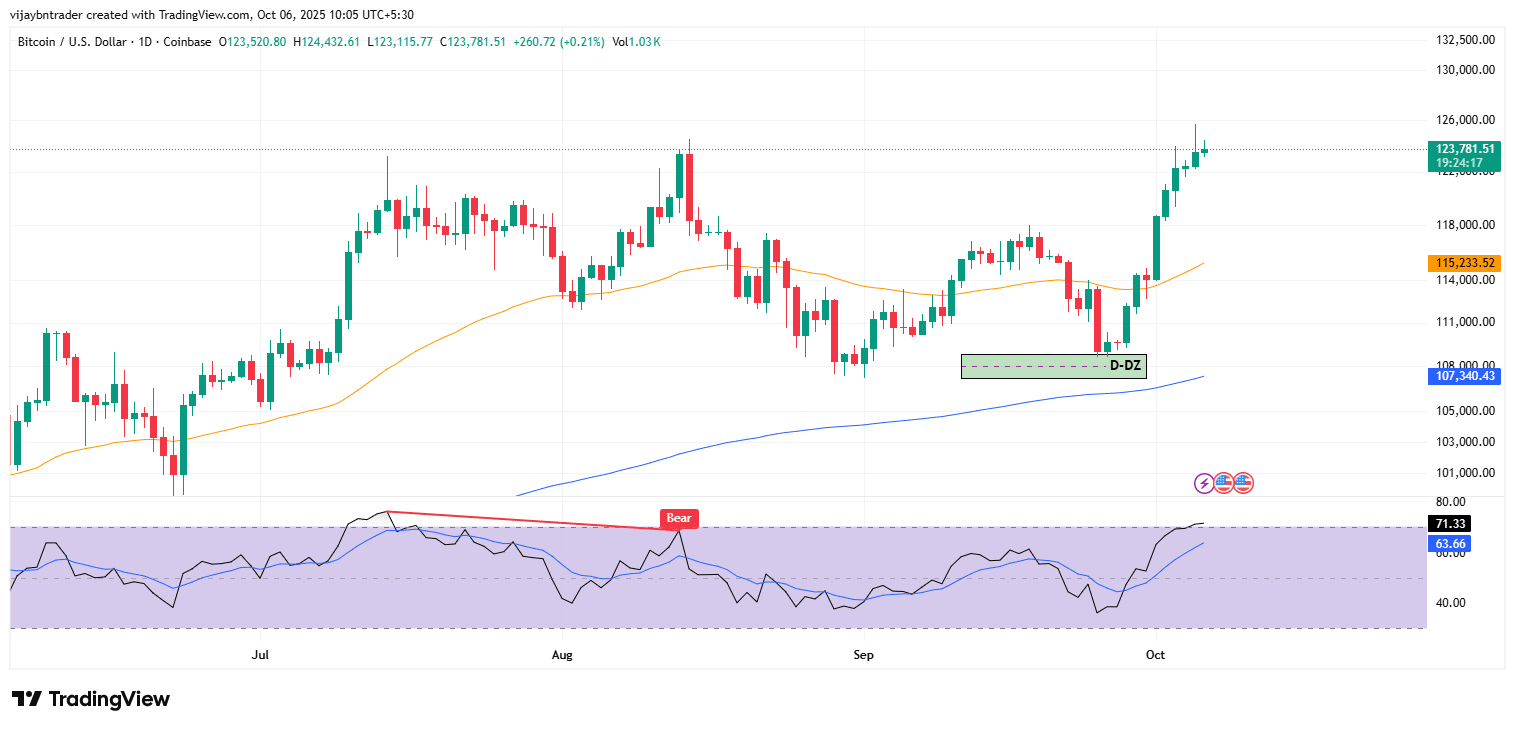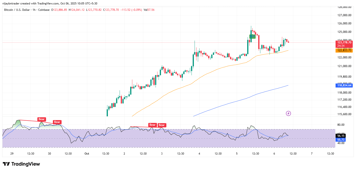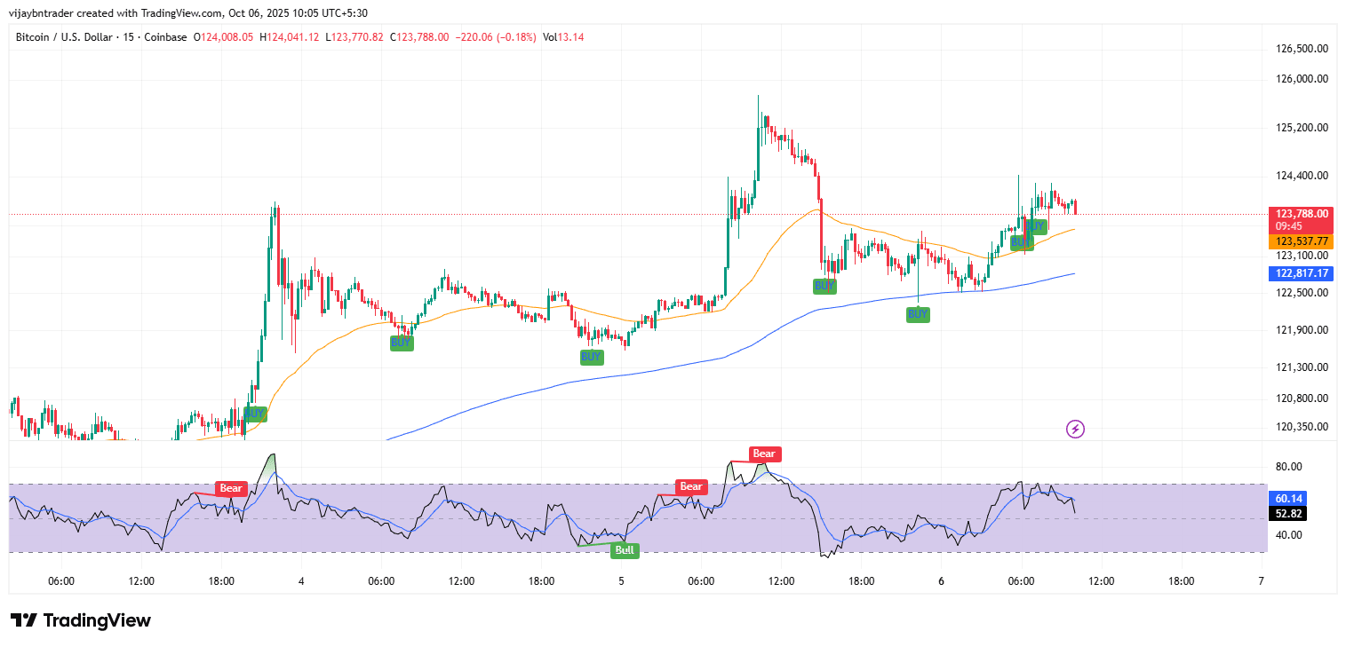 In sintesi: il bias rimane moderatamente rialzista mentre 123.1k–122.8k si mantiene e l'RSI rimane sopra 50 sui frame intraday; la forza sopra 124.6k dovrebbe sbloccare 125.5k–126.0k, mentre una chiusura sotto 122.8k costringerà probabilmente un pullback di riparazione del trend in 121.9k–121.3k prima della prossima decisione.