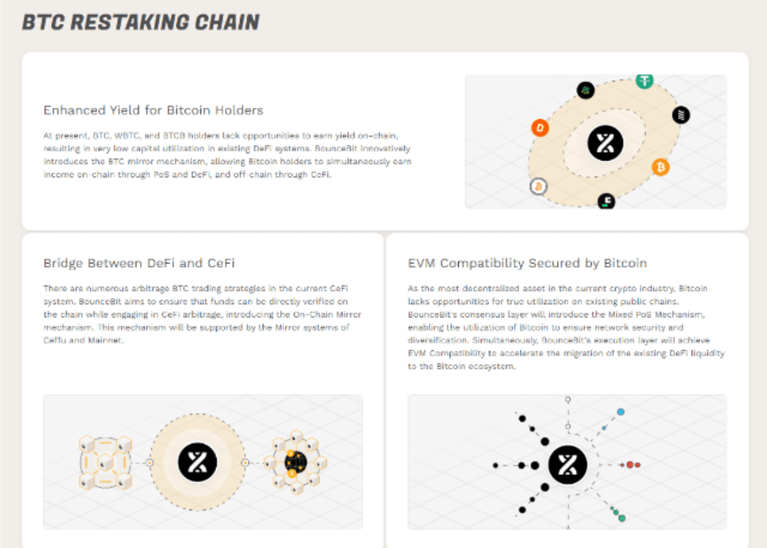 BounceBit Chain: L'infrastruttura centrale di BounceBit è una blockchain Layer 1 che combina la sicurezza di Bitcoin con la compatibilità con Ethereum Virtual Machine (EVM). Ciò significa che BounceBit non è limitato solo a Bitcoin; può interagire con protocolli DeFi basati su Ethereum, rendendo facile per gli utenti mettere in staking i propri BTC e partecipare a una vasta gamma di applicazioni decentralizzate (dApps). BounceBit porta davvero Bitcoin nel mondo DeFi senza compromettere le caratteristiche di sicurezza originali che rendono Bitcoin così prezioso.