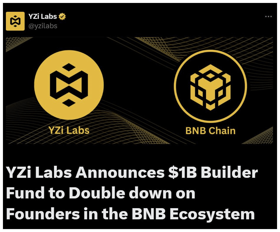 Yzi Labs ha appena svelato un massiccio fondo da 1 miliardo di dollari per supportare gli sviluppatori che costruiscono sulla BNB Chain. È un enorme numero per qualsiasi Layer 1 in questo momento (eccetto forse Ethereum o Solana).