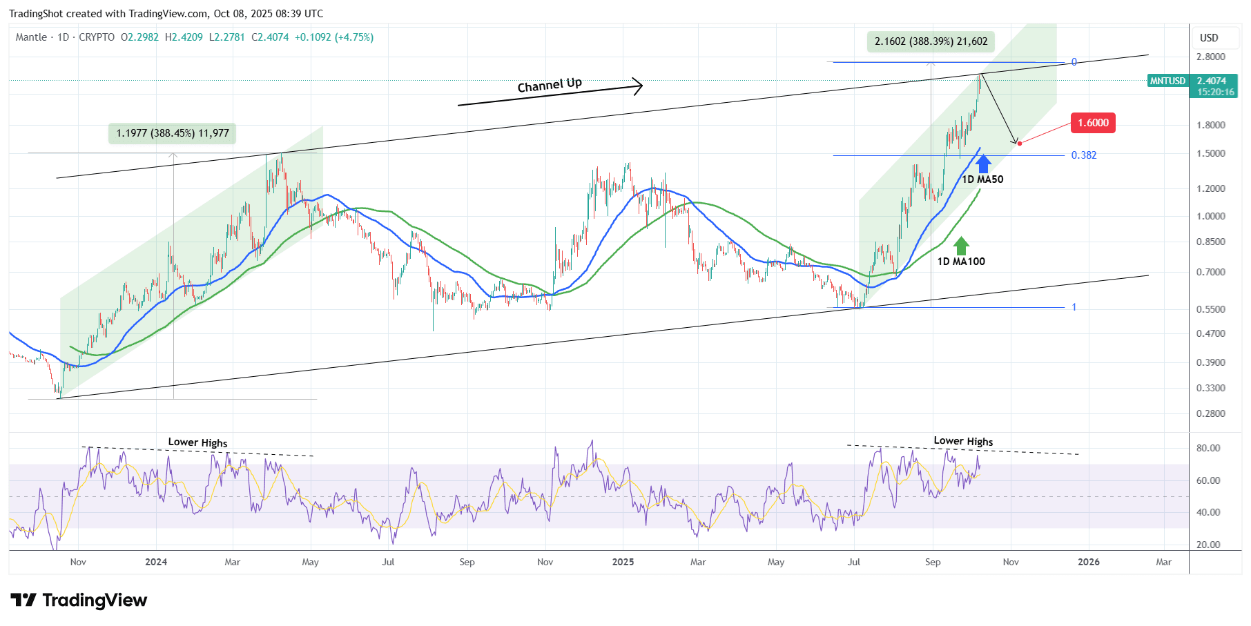 Mantle (MNTUSD) è stata negoziata all'interno di un Canale In Risalita sin dal suo minimo di mercato del 18 ottobre 2023 e in questo momento il prezzo ha appena toccato il massimo (linea di tendenza dei Massimi Superiori) di questo schema.