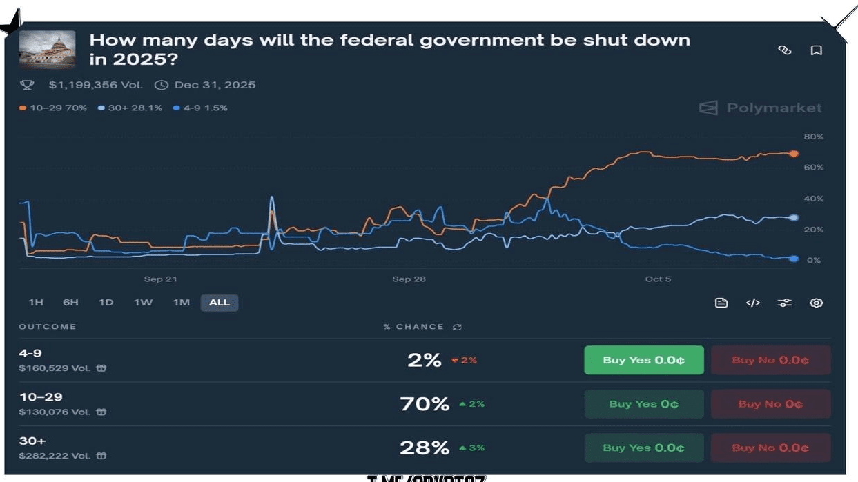 ➥ La sospensione del governo degli Stati Uniti potrebbe durare quasi un mese con una probabilità del 70% (basato sulle tariffe di Polymarket)