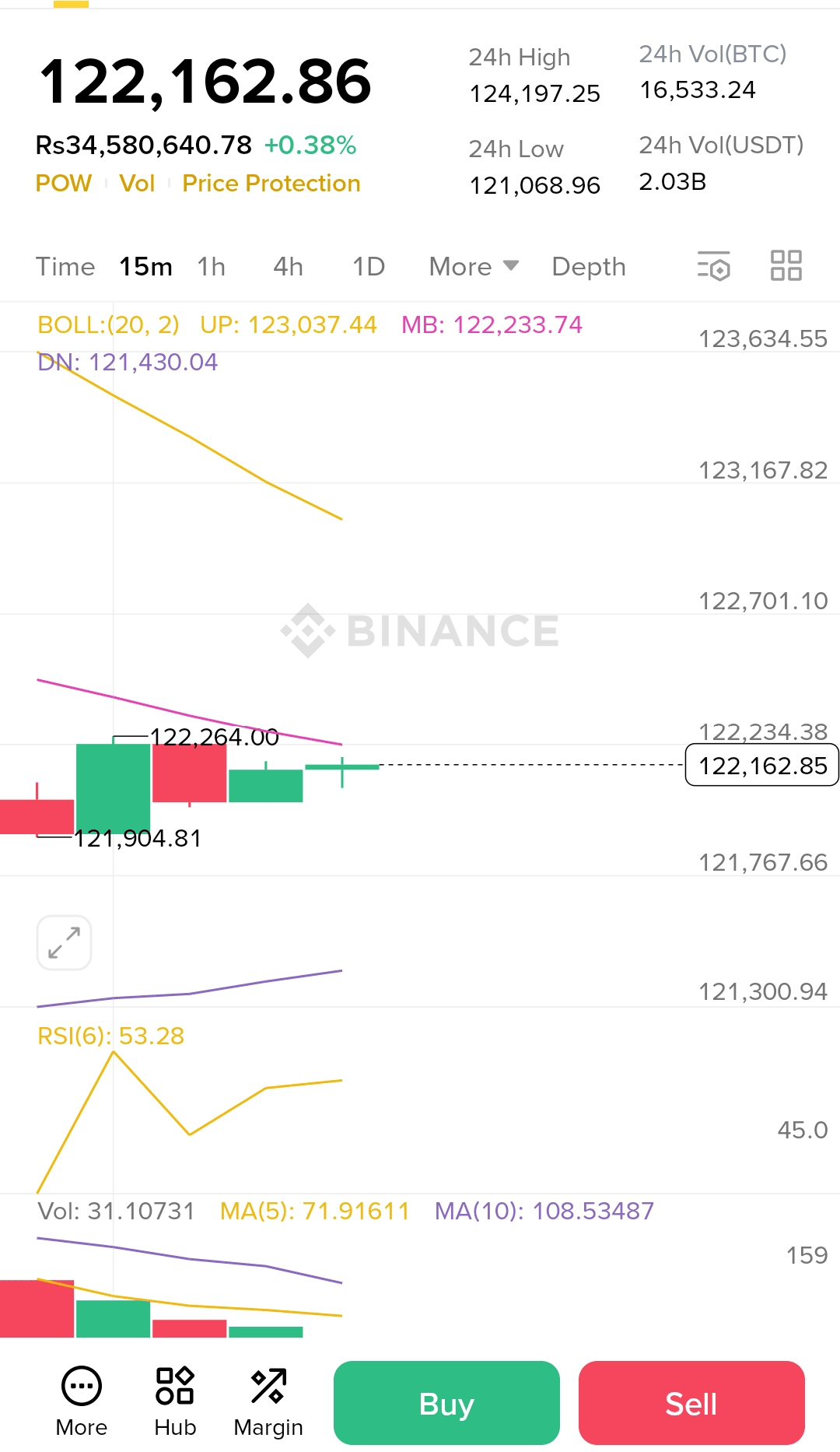 Bitcoin (BTC) si mantiene saldo attorno a Rs 122,162, mostrando un lieve guadagno del +0,38% nelle ultime 24 ore. Dopo aver raggiunto un massimo di 24 ore di Rs 124,197, il mercato ha iniziato a consolidarsi — formando un intervallo di trading ristretto tra Rs 121,068 e Rs 124,000.