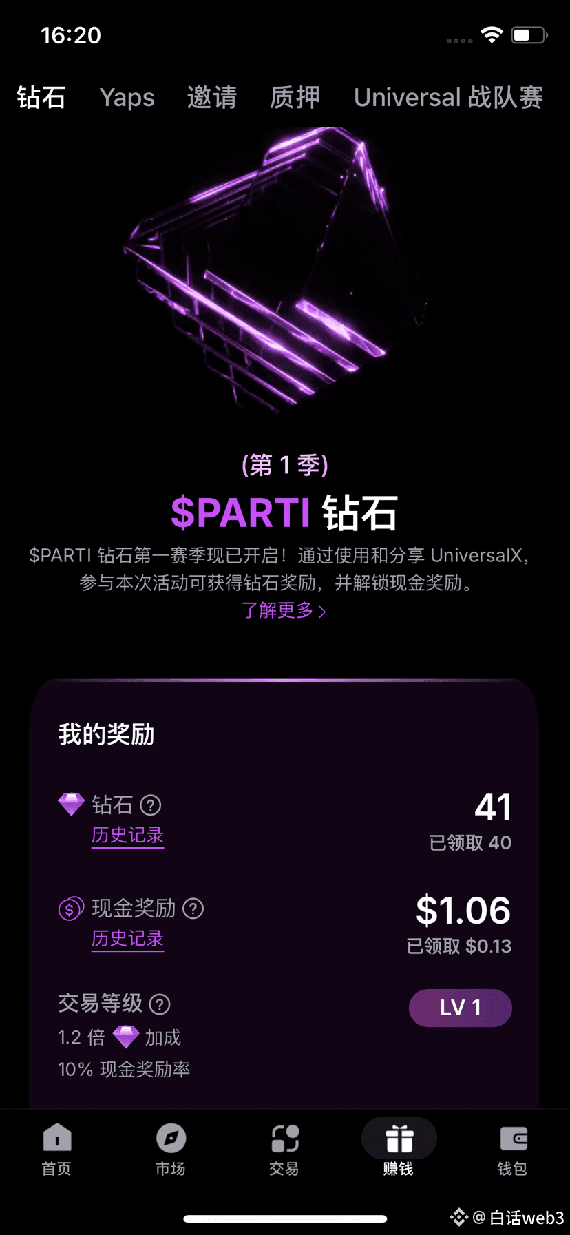交易得钻石,还有手续费返佣,钻石换空投奖励, 传送