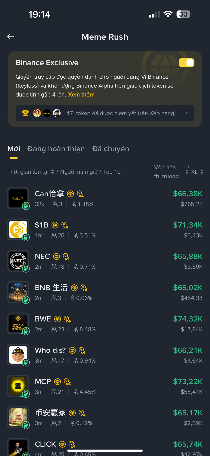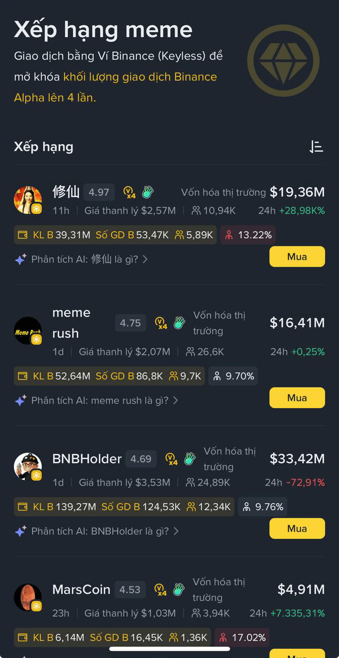 Aumentare di 4 volte il Volume di Trading Alpha: Gli utenti vedranno aumentare di 4 volte il volume di trading su tutti i token Meme Rush durante le Fasi Meme Rush e nei 30 giorni dopo che il token è stato introdotto su Binance Alpha (se idonei).