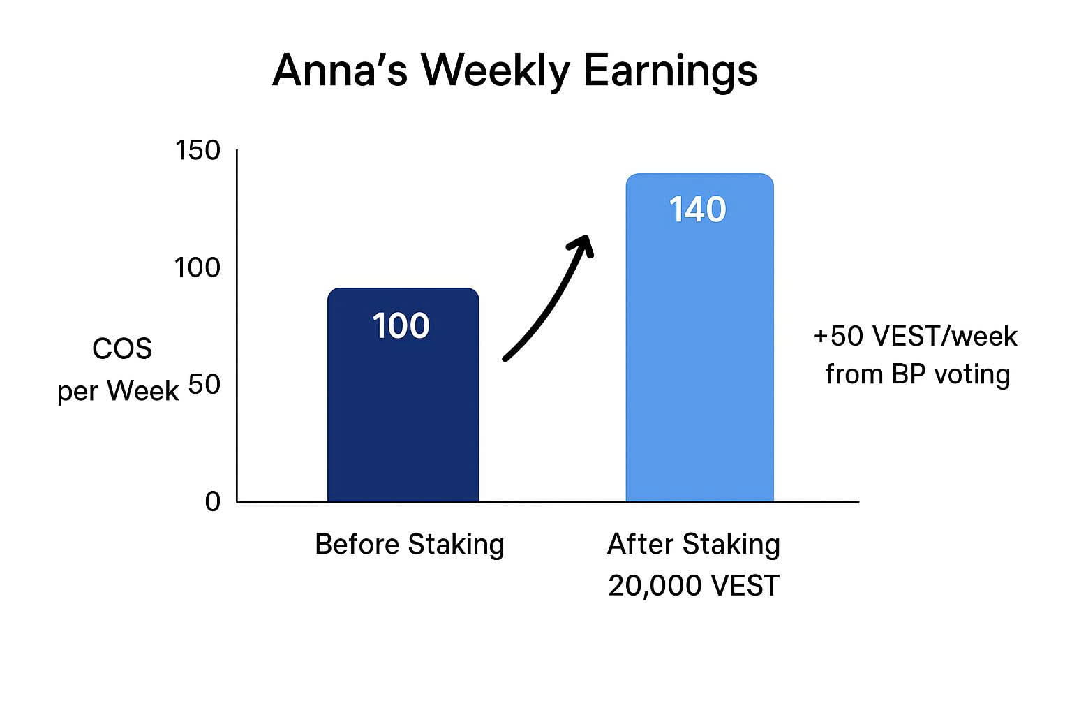 La storia di Anna illustra una verità più grande: lo staking di COS in VEST non riguarda solo il guadagnare di più, ma il diventare di più. Più empowered, più influente, più connesso al futuro dell'ecosistema.