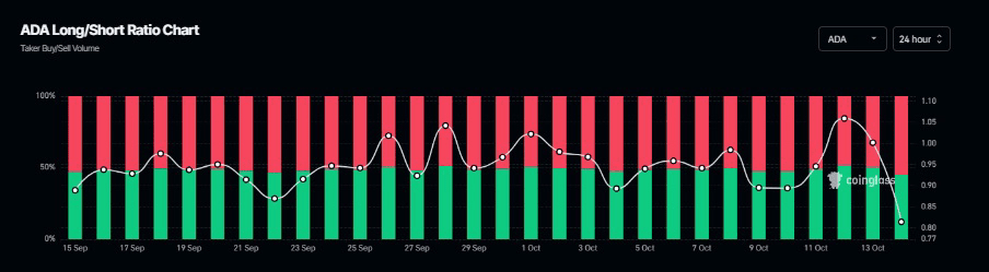 Sul fronte delle derivati, il rapporto tra scommesse lunghe e corte per la criptovaluta $ADA di CoinGlass, che è 0,81, è il valore più basso da un mese. Questo rapporto, che è inferiore a uno, riflette un sentiment ribassista nei mercati, poiché più trader scommettono su un calo del prezzo dell'asset.
