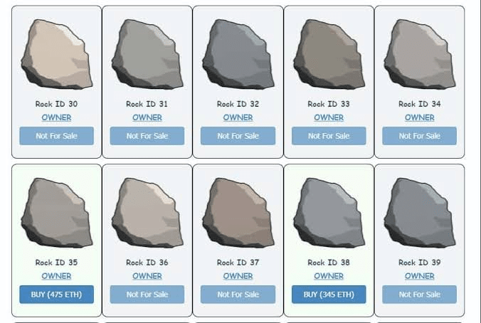 Questo colpisce in modo diverso: nel 2017 un piccolo progetto chiamato EtherRock ha lanciato 100 identici pixel rocks come NFT su Ethereum. Niente arte sfoggiata, nessuna utilità nascosta, solo un'immagine statica di una roccia e proprietà blockchain. Questo è tutto.