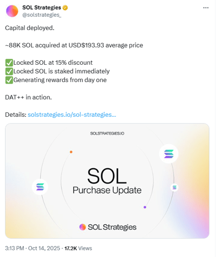 I principali attori del tesoro di Solana sono appena andati a fare shopping durante il calo—e hanno ottenuto un affare incredibile. #SolStrategies hanno preso 88.433 $SOL (inclusi 79K token bloccati con uno sconto del 15% direttamente dalla Solana Foundation), portando il loro totale a 435.064 #SOL del valore di $85,9M. I token bloccati sono già stati messi in staking e generano rendimento mentre aspettano il sblocco di 12 mesi. Ecco come si gioca a scacchi 4D durante la volatilità.@Solana Official