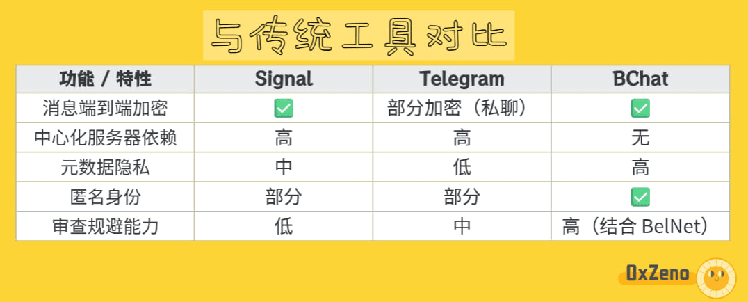 Per me, il maggiore punto di forza di BChat non è la funzione di chat in sé, ma la risoluzione del problema della privacy a livello di architettura di rete di base, cosa rara in altri strumenti di chat crittografata.
