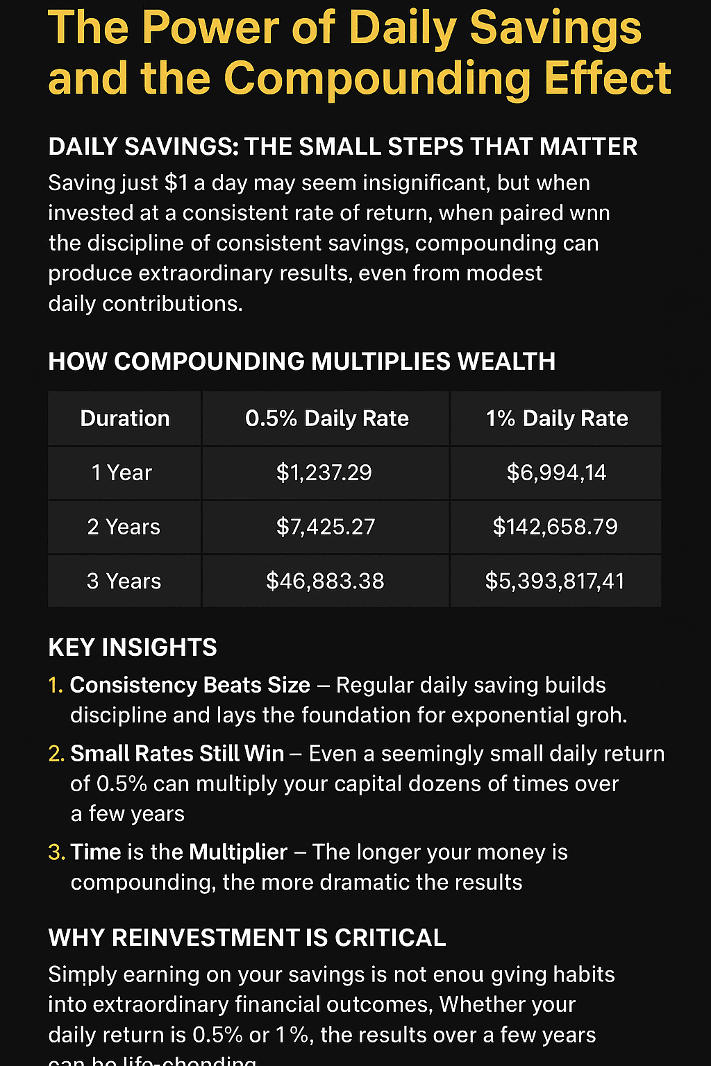 Risparmiare solo $1 al giorno può sembrare insignificante, ma quando investito a un tasso di rendimento costante, la crescita diventa esponenziale. Il segreto sta nel reinvestire i profitti nel capitale — creando un ciclo di accumulo di ricchezza auto-accelerante.