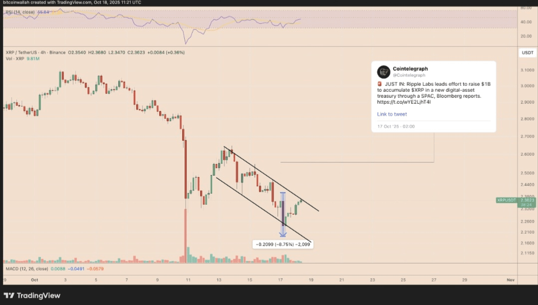 Guardando in modo ampio, XRP è fluttuato all'interno di un modello di cuneo discendente dopo il rout del mercato crypto della scorsa settimana, che ha liquidato un record di $20 miliardi o più in posizioni.